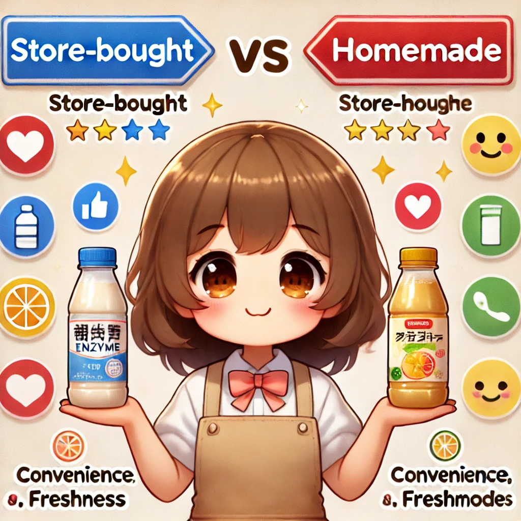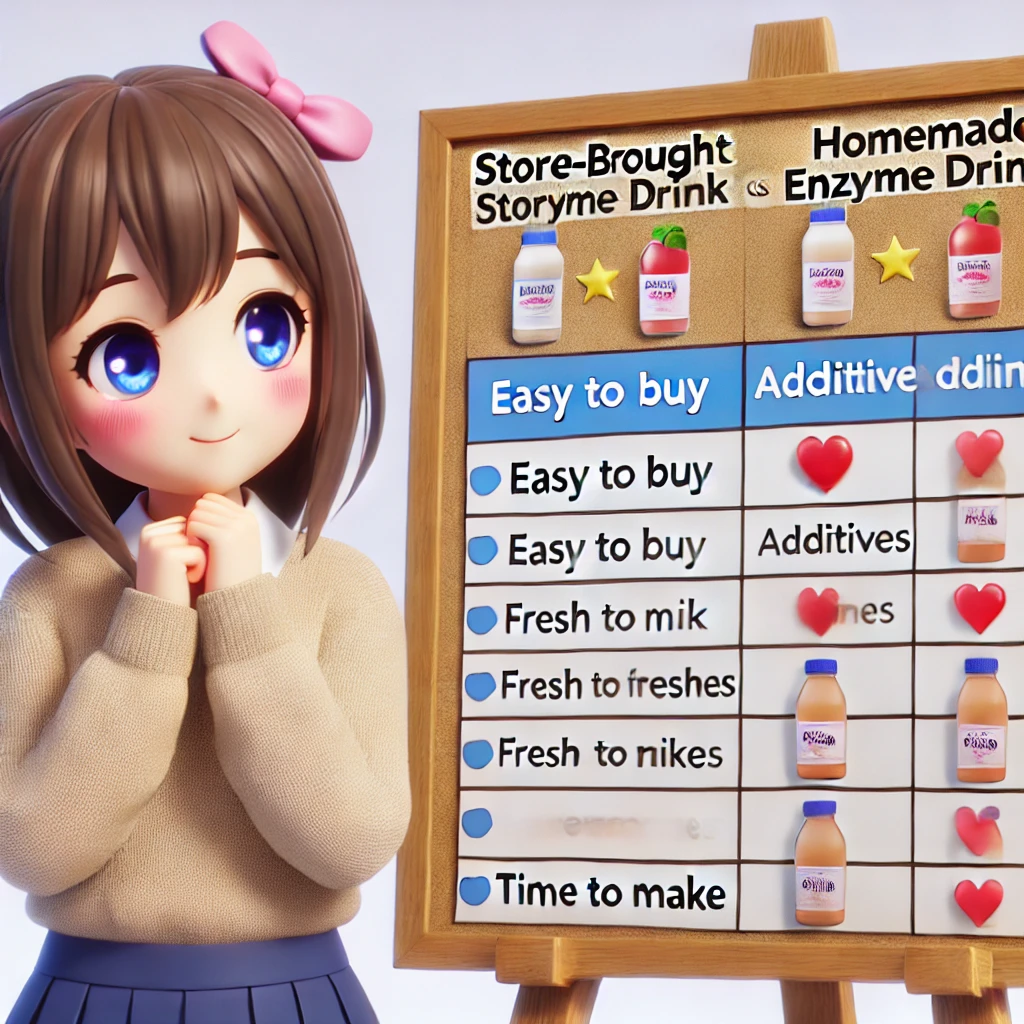 この記事では、市販の酵素ドリンクと自家製酵素ドリンクの違い・効果・安全性・コスパなどを徹底比較し、どちらがあなたに合っているかを解説します。